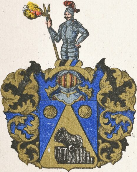 ”… Skölden fördelt triangelvis utj trenne delar det medelste fältet är af gull, hwarutj ligger en swart Fyrmösare uppå en lavett, dhe bägge yttre fälterne äro blå med en gyllende kula i hwardera fältet, åfwan på Skiölden en öppen tornerhielm, hwarutur den öfre delen en bewäpnad man upstiger, hållandes en staka med en brinnande lunta i handen, Krantzen och löfwärcket är af Gull, blått och swart, aldeles som detta wapnet med sine egentelige färgor här hoos finnes utsatt och afmåhlat; …”