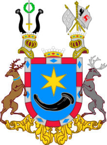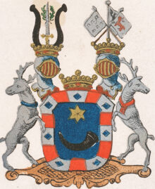 ”… En med Borde omgifwen Blå Sköld, hwaruti förekommer Ett liggande Swart Horn; Stickelen wänd emot Höger, med en deröfwer swäfwande Sex-uddig Stjerna af Guld. Borden är fördelt i Fjorton delar, hälften Röde, och hälften af Silfwer, och i hwar och en af Silfwer-fördelningarne en Blå liggande Sned-Ruta, som altså till antalet utgöra Sju Stycken, hwilka hafwa afseende på det Adeliga von Torkenska, desz Möderne Wapen. Ofwan på Skölden står en Fri-HerreKrona mellan Twänne äfwen med Fri-Herrlige Kronor krönte, och med Fem Gyllende Byglar försedde Öppne Torner-Hjelmar. Uppå den Högra Hjelm-Kronan stå uppreste Twänne Swarta Buffel-Horn, och mellan dem Ett Twåhändigt Swärd, Fästet af Guld, Klingan af Silfwer, med en nedan om Spetsen hängande Grön Lager-krants. På den Wänstra Hjelmen är planterad en Sjö-Flagg med Twänne der öfwer i kors lagde Lif-Fahnor, alle af Silfwer, med Stängerne af Guld. Uti den Högra Fahnan sesz Österbottniske Wapnet, Sex löpande Hermeliner, och i den Wänstra, Wästerbottniska, en Rehn; men Sjö-flaggan, hwars Spetsar äro om Stången wefwade, är tecknad med en Swart, fläckt krönter Örn. Sköld-hållare äro till Höger en Hjort, med ett Blått Guld-kantadt Hals-band, och till Wänster en Rehn, med en Röd Silfwer-kantad, och Silfwer-broderad Lapp-Sehle, bägge naturligt målade, och med utwände Hufwuden: Alldeles som detta Wapen med sina rätta Färgor här hos afmåladt finnes.”