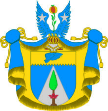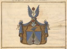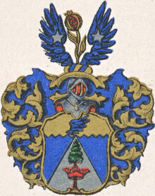 ”… En med Tandskura i Twäran fördelt Skiöld, hwars öfra Fäldt som utgiör En Trediedehl af Skiölden är af Guld, och förer en mot wänster utslagen blå Winge eller Flygt. I nedra Fäldtet som är Blått, förekommer En Spets af Silfwer, som tager sin början till En Fierdedel åfwanföre Skiöldens fot, och drager sig med sin Spets tillhopa tätt in till Tandskuran, på hwilcken Spets wäxer ett Grönskande Ceder Träd, hwars Stam med En Röd Crona är Zirad. Ofwan på den Öpne Tornerhielmen Upwäxer Ett Gyllende Granat Äple med Röda Kiärnor på En hög stielck med Twenne gröna Blad, emellan Twenne Blå Utslagne Wingar, som med hwar sin FemUddig Stierna af Silfwer är belagd, Crantzen är af Guld och Blått, och Wapentäcket till Inre sidan af Guld och till den Yttra Blått, Aldeles som detta Wapen med sina egenteliga Färgor härhos Afmålat finnes.”