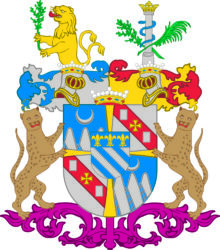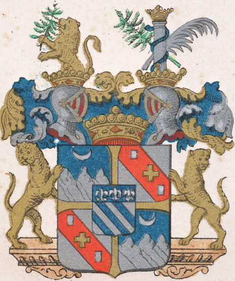 ”… En Skiöld fördelt i fyra Fält, hwilcka med ett gyllene Korsz ifrån hwar andra skilias, och mitt uppå fördehlningen des förre Adelige Stam wapen, som är en Skiöld af Silfwer, hwaruti wijsa sig trenne Blå Bander, öfwer hwilcka är en blå Chef Zijrad med trenne Lillior af Gull; Men af sielfwa Frijherrlige Wapnet är det första Fältet Blått, hwaruti ligga tre försilfrade Berg, flytandes en Ström emellan hwardera Berget, och öfwer de samme lyser en tilltagande Måna af Silfwer; Det andra Fältet är af Silfwer, öfwer hwilcket går en röd Bande, hwaruppå sees ett Korsz af Gull emellan twenne Billetter af Silfwer; Det tredie Fältet är i alt likt med det andra; Så och det Fierde med det första. Ofwan på Skiölden stå twenne öpne Tornerhielmar, med en Frijherrlig Crona emellan, och en på hwardera Hielmen; Utur den högre Hielm Cronan sträcker sig öfre dehlen af ett gyllene Leijon, som håller med högre Ramen en grön Cederqwist; Uppå den wänstra, står en Crönt Pelare af silfwer, emellan en grön Ceder- och Palmqwist, som äro korswijs stälte, och omkring Pelaren slingrar sig en blå Orm; Löfwärcket är af Gull, Silfwer, Blått och Rödt, och Wapnet Supporteras af twenne Leoparder, aldeles som det samma med sine egentelige färgor här bredewid afmålat finnes; …”
