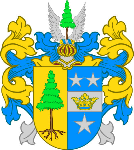 ”… Een uthj Twäran i Twenne lijka deelar fördeelt Skiöld, uthj hwilkens högre Fält af Gull ståår ett grönt CederTrä, men det wänstra Fältet är blått och däröfwer een bielke af Sölfwer emellan Trenne Stiernor af samma Metall Zijrad och beprydd medh een bourlet eller adeligh Crona af Gull och blått, åfwan på Skiölden är een öppen Torrnerehielm hwaröfwer ståår ett grönt CederTrä emellan Twenne Wingar af Sölfwer. Crantzen och Löfwärket af Gull blått och Sölfwer mängt och fördeelt, aldeles som sielfwa Wapnet medh sine egentelige färgor här hoos repræsenterat och afmåhlat står, …”