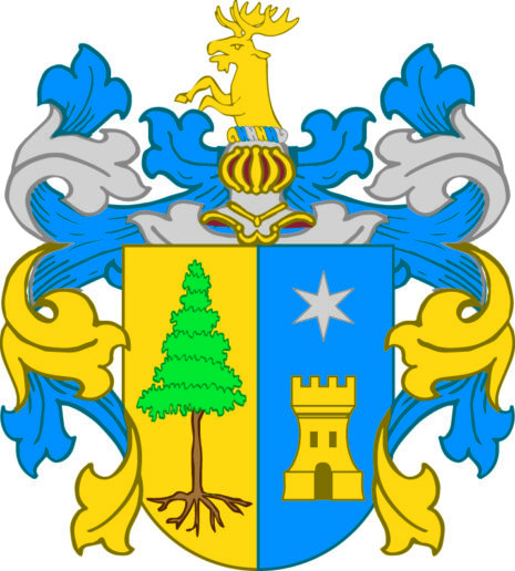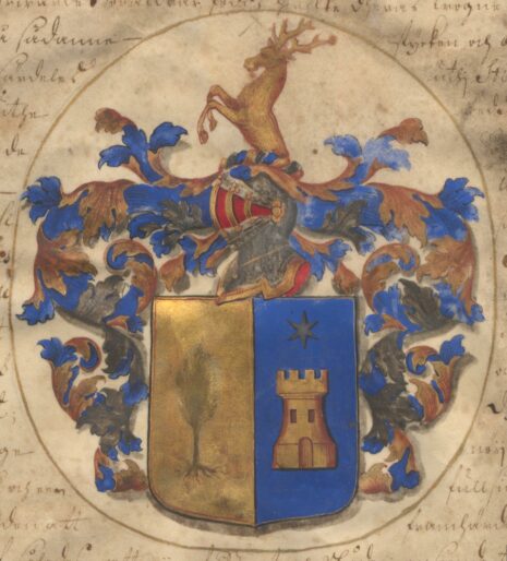 ”… Skiölden fördeelt i Lengden uthj twenne lijka deelar, dhet högre fälltet är af gull der uthj ståår ett grönt CederTrä, det wänstre Fälltet är blådt och der uthj ett Castell af Gull, hwaröfwer lyser een Sexuddat stierna af Sölfwer, ofwan på skiölden een öppen Tornehrehielm uthur hwilken opstijger een half Älgh af Gull. Crantzen och Lööfwärket af Gull, blådt och Sölfwer, medh hwart om annat bemängdt, aldeles som detta Wapn medh sine egentelige färgor här hoos repræsenterat och afmåhlat ståår; …”