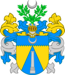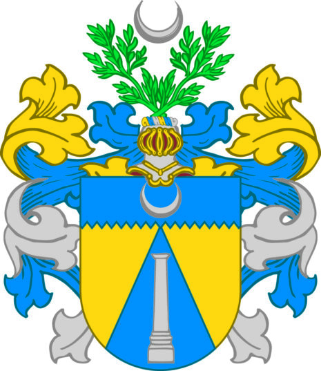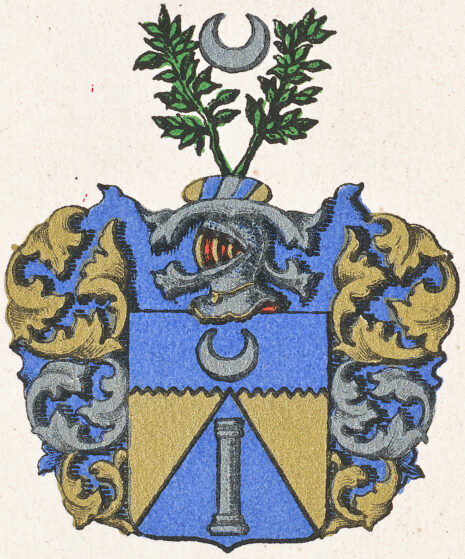 ”… en Skiöld genom twänne spitzigt åpföre sammangående streck fördeeld i tree dehler, warandes det medlersta Fältet blått, i hwilket står en stålpe af Sölfr de bägge yttre äro frije Fällt af gulld; Ofwerst i Skiölden sees en uddig Chef af blå färg, mitt uppå Zijrad med en tilltagande Måne af Sölfr . Ofwan på Skiölden står en öpen Tornerhielm, hwaröfwer wisar sig en tilltagande Måne af Sölfwer, emellan twänne gröna Cederqwistar. Crantzen och Löfwärcket är af gulld, Sölfwer och blått; aldehles som detta wapn med des egentelge färgor här hos afmåhlat finnes.”