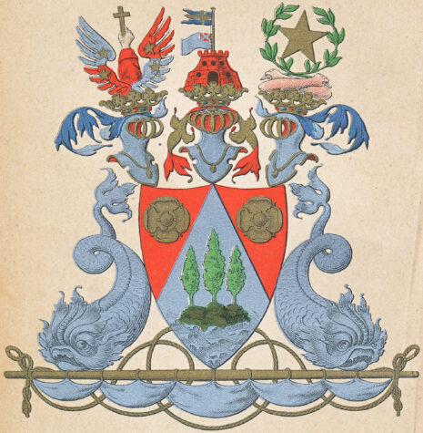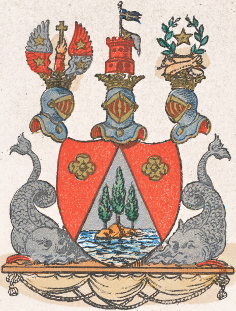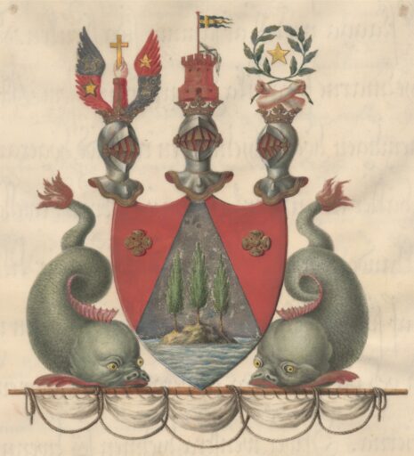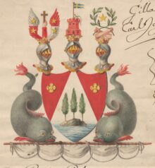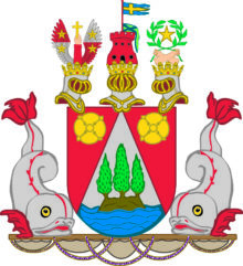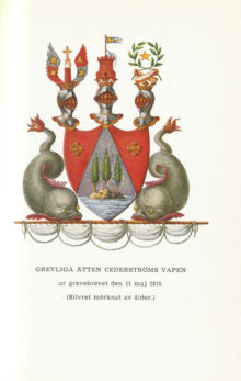 ”… En Sköld, belagd med en spets af silfwer, uti hwilken stå trenne grönskande Cedrar på ett uti en ström warande berg. I hwartdera af sidofälten, som äro röda, ses en fyrabladig gyllene Ros. På skölden stå trenne med Grefweliga kronor betäckta öppna Tornerhjelmar och på den medlersta af dem ett rundt ofwantill creneleradt Castell med hwälfd port emellan twå runda styckegluggar, samt med trenne dylika i bredd upptill: warande på castellet upprest en flaggstång, på hwilken öfwerst ses Swenska Örlogsflaggan åt höger swajande, men en Rysk flagga nertill åt samma sida struken. De twenne andra hjelmarne föra lika hjelmprydnad som Ättens Friherrewapen, nemligen högra hjelmen en rödklädd högerarm, som i handen håller ett guldkors och är uppsträckt emellan twenne utåt fläktande wingar, af hwilka den högra är till öfra hälften af silfwer och till den nedra röd, men den wenstra twertom, och på hwardera af deras afdelningar en femuddig gyllene stjerna. Öfwer wenstra hjelmen ses twenne i kors lagda armar med händerna hållande i kors twenne till en krans böjda gröna lagerqwistar, emellan hwilka en femuddig gyllene stjerna swäfwar. Skölden stödjes å hwardera sidan af en Delfin med uppåt i ring slagen stjert, liggande på en skeppsrå med derwid bundet eller uppfångadt segel; Alldeles såsom Wapnet här med sina rätta och egentliga färger afmåladt finnes.”