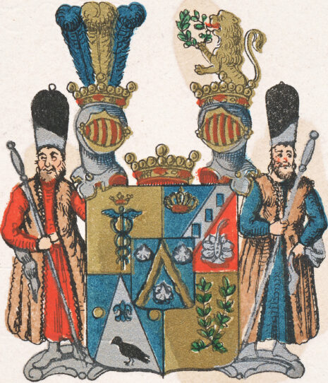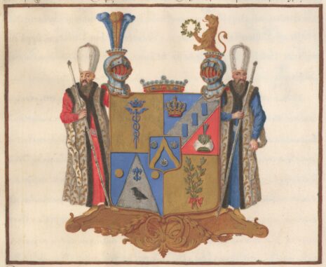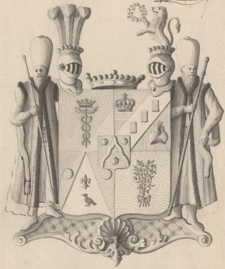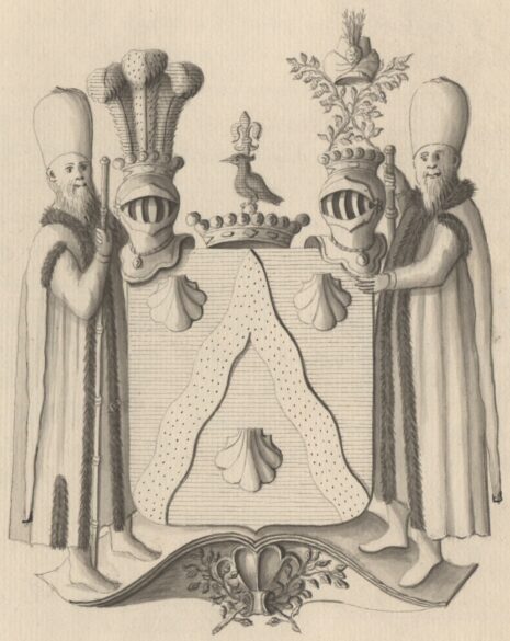 ”… En Fyrdelad Skjöld, och mitt uti delningen belagd med en Hjert-Skjöld, innefattande dess förra Adeliga Stam Wapn, som är en wågig Gyllende Sparre, emellan Twenne Nedwände Convexe Silfwer Musslor, i blått Fält. Af den yttre Skjölden är Första Fältet af Guld, hwaruti står uprest en blå Mercurii-Staf under en blå Crona. Det Andra Fäldtet är afdelat med en Silfwer Barre, uppå hwilcken Tre blå Billetter Pale-wis äro stäldte, men Barren åfwantill åtfölgd af en Swensk gyllende Kongl: Crona, i blått, samt nedantill af en Hwit lindad, och med en Jouvels-Aigrette samt Häger Fjädrar decorerad Turkisk Keysserlig Turbant i Rödt Fält. Det Tredje Fältet innehåller dess Mödernes- det Adeliga Wallrawiska Wapnet, som är fördelt af en upstigande Silfwerspets, uppå hwilcken en Swart till Höger wänd Korp synes under en blå Fransk Lillja, men på hwardera sidan om Spetsen i de blå Fäldten, är en Besantin eller Penning af Guld. Det Fjerde Fältet är lika med det Första, af Guld; Uti det samma synes Twenne med Rödt band sammanbundne Olive-Qwistar. Uppå Skjölden stå Twenne med Fri Herre Cronor krönte Öppna Tornere Hjelmar, och emellan dem uppå sjelfwa Skjölden hwilar en större Fri Herre Crona. Uppå Högra Hjelm Cronan aro Trenne Struss Fjädrar, den Medlersta af Guld och de Yttre Blå. Och på den Wänstra upreser sig till Hälften ett mot Höger wändt gyllende Leijon, Hållande i Högra Ramen en Grön Crantz. Skjöldhållare äro Twenne Förste Turckiske Introducteurer i deras Ceremonie drägt, med Höga Hwita Turbanter, och Guld blommerade Hwita, med Zobel brämade Caftaner, Gula Stöflor, och Silfwerstaf i Händerne; Stående likasom Skjölden, uppå en gyllende Piéd d’ Estal. Aldeles som det samma, med sina rätta och egenteliga Färgor, Här frammanföre afmålat finnes.”