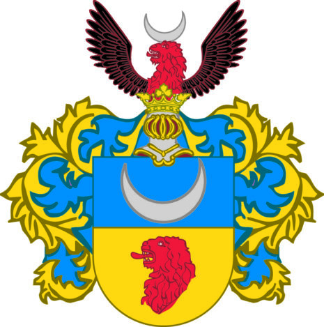 ”… een fördeelt Sköldh medh twenne fiäll, dett öfre blått, på huilket ståår een half månadh sölffuerfärga; det nedre fiället guhlt, på huilket ståår ett rödt Leijonhufwud, medh een Vthsträckt rööd tunga; offuan på Skolden en öpen Tornerhielm, tecket och Crantzen medh blått och guhlt fördeelt; På hielmen een förgylt Chrona, på Chronan ett rödt Leijonhufwudh medh een rödh Vthsträckt tunga; offuan på Leijonhufwudh en half Månadh medh sölffuer färga, ståendes mitt emellan twenne Swarta örne wingar; effter som dett medh sine naturlige färgor här afmåhlat och repræsenterat ståår: …”