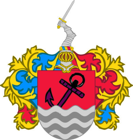 ”… Ett ankar fästat på siöbotten, eller uppå en hwijt och Rödh Skiöldh, öffwan på Skiölden en yppen Tornerehielm, teknad och Crantzen medh blådt och rödt och gult fördelte offwan på hielmen en bewäpnad Arm med blåttat och dragit swärdh til kienne märkie och wittnes börd, af deras Sahl. faders och deras Tapperhet och manlige bedriffter, aldeles Som ded med sine egentlige färgor her affmåhlat och RePresenterat står.”
