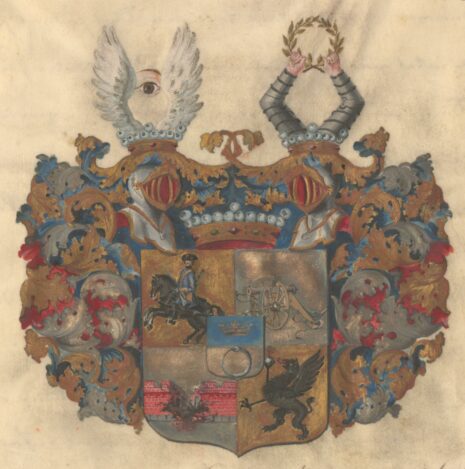 ”… een Skiöld fördehlt i fyra Fält, och mitt uti densamma des förre Adelige Stamwapen, som är en Skiöld fördehlt i twären i twenne lika delar, uti det öfre Fältet som är blått är en Krona af Silfwer, och uti det nedre som är af Silfwer wisar sig en runderkastad Orm af naturlig färg, hafwandes Hufwudet up och stierten i munnen, men af sielfwa Frijherliga Wapnet är det första Fältet af Gull, och deruti en Dragon, ridandes uti fult galop på en repfärgad Häst, warandes Dragonen klädd i blå kläder med guhl Carbinrem och gehäng, hållandes Wärjan i högra handen fram För sig och tygelen i den wänstra; samt en studzare på ryggen; fram på Hästen finnes en förbögel med ögla, rem och haka, och bak om länden en bögel med en ögla till anspänningen; det andra Fältet är af Silfwer med en Canon liggandes på en lavet med sine naturlige färgor, och wisar sig fram före Anspans taglet med en haka eller krook i ändan, sammaledes bak i Swantzen af laveten den af handspiken dirigerat blir; det tredie Fältet är deslikes af Silfwer och deruti en röd Tegel Muur med breche mitt på, iemte en hoop nederfallne stenar. Uti det fierde Fältet som är af Gull, synes en Swart Grijp som hålller uti klona med högra framfoten en antänd Eldkula, ståendes elliest på bakföttren med utslagne wingar och den wänstra framfoten helt utspänd; Ofwan på Skiölden äro twenne öpne Tornerhielmar med en Frijherrlig Krona emellan och en på hwardera Hielmen; Utur den högra Hielmkronan upstiga twenne utslagne hwita Dufwewingar, och emellan desamme wisar sig ett naturligt öga; Utur den wänstra Hielmkronan utsträcka sig twenne Armar med Harnesk, hållandes emellan Händerne en Lagerkrantz; Krantzen och Löfwärcket är af Gull, Silfwer, blått och rödt, aldeles som detta Wapen med sine egentelige färgor härhoos afmålat står.”