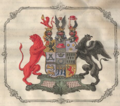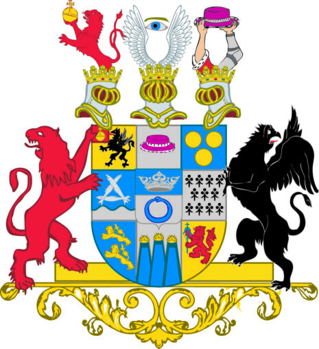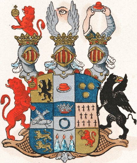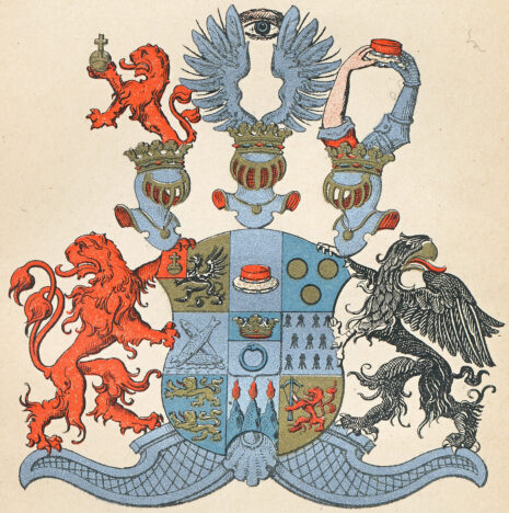 ”… En twå gånger klufwen, och lika många Gånger Delad Sköld, och således njo Fält, hwars medlersta blir Hiert Skölden, hwaruti desz förra Adeliga Wapn står, som är en delad Sköld, hwars öfra Fält är Blått, hwaruti en Öppen Krona af Silfwer stäld är, det Nedra Silfwer, hwaruti en blå Orm, som biter sig i Stierten i en hel Cirkel stäld är, af Grefweliga Wapnet är Första Fältet Guld, hwaruti en Swart åt Höger uprest Grip med utslagna Wingar stält är, i Öfra Hörnet af Fältet till höger, synes en liten Röd Skiöld, hwaruti et Gyllende Riks Äple stält är. Det Andra Fältet är Silfwer, öfwerlagt med en af Purpur och Hermelin öfwerdragen Råds Hatt. Det Tredie Fältet är Blåt, hwaruti Trenne Gyllende Penningar i förwänd Triangel stälte äro. Det Fierde är ock Blåt, hwaruti Trenne Grundlar eller Norsar af Silfwer i Rät upstående Triangel lagde äro: wid Foten af Fältet flyter en Silfwer Ström. Det Femte Fältet är Silfwer, öfwerlagt med Ellowa Swarta Hermeliner i Trenne Rader. Fyra, Tre, Fyra. Det Siette Fältet är Blåt, hwaruti springer Twänne Gyllende Leijon öfwer hwarandra. Det Siunde Fältet är Silfwer, hwaruti Trenne Blå Berg med Guld Flammor i bredd stälte äro. Det Åttonde Fältet är Guld, hwaruti ett åt Höger uprest Rödt Leijon är, hållandes emellan Ramarne en utspänder Blå Båge. Åfwanpå Skölden står Trenne Öppne Torner-Hielmar, beprydde med Grefweliga Kronor, på den Medlersta, som är Stam Hielmen, står Twänne ifrån hwarandra utslagne Wingar af Silfwer, hwaremellan sees et Naturligt Öga. På den Högra upstiger till Hälften et Rödt Leijon, hållandes i Högra Ramen et Riks Äple af Guld; på den Wänstra upresa sig Twänne Armar emot hwarandra, den Högra beklädd med Purpur och Hermelin, Den Wänstra öfwerdragen med Silfwer Harnesk, hållandes emellan Händren en dylik Hatt, som i Andra Fältet står. Skiölden hwilar på en Piedestall, och hålles till Höger af et Rödt Lejon, och till Wänster af en Swart Grijp, bägge med Hufwuden utwände, Aldeles som det här ofwan med sine rätte och egenteliga Färgor står afmålat; …”