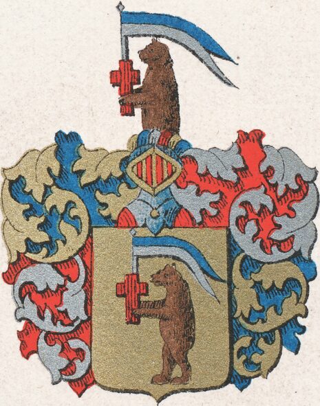 ”. . . En skölld med gul ferge och derutij en svart biörn oprest stÃ¥endes, haffvandes ett rött kÃ¥rs med en ryttere fahne ther ofvan oppÃ¥, fördelt medh hvitt och blÃ¥tt. Ofvan pÃ¥ sköllden en öppen tornerhiellm medh en halff biörn, crantzen och hiellmtecket medh gult och svart fördeelt, efftersom sielfve vapnedh här affmÃ¥led dett videre uthvijser. . . .”