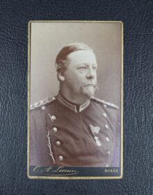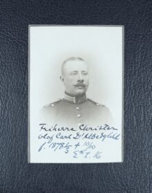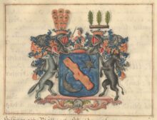 ”… Nemligen, deβ gamla Adelige Wapn, som är: En blå Skiöld, hwaruti sees en bandewijs stält, å bägge ändar afhuggen knagglug Stubbe af Gull emellan en Sexuddig Stierna och en tilltagande Måna, bägge af Silfwer. Ofwan på Skiölden stå twänne öpne Torneerhielmar med en Friherrlig Crona emellan, och en på hwardera Hielmen; Utur medlersta Cronan upstiger öfre dehlen af en Man klädder i gammal Rommersk dräckt, hållandes en dragen wäria med högra handen, som bemärcker Famillens härkomst utur Italien. Uppå den högra hielm-Cronan sees nije stycken Påfogle fiädrar, tre öfwer hwarandra stälte, och på den wänstra ligger en afhuggen brun stubbe, med tre gröna, brede wid hwarannan wuxna Nesselblad uppå. Löfwärcket är af Gull, Silfwer och Blått, och Skiölden Supporteras å högra sidan af en tillbaka seende blå grå Warg, utur hwilckens högra framfot drypa några bloddråppar, som är deβ Mödernes von Wulffens Wapen, och å wänstra sidan af en tillbaka seende swart Oxe till Åminnelse af deβ Sal. Faders Mödernes von Tisenhausens Famille, aldeles som detta Wapnet med sina egenteliga färgor här hoos afmålat finnes.”