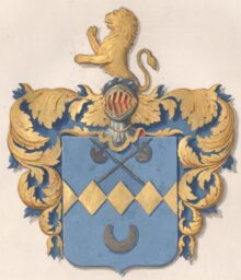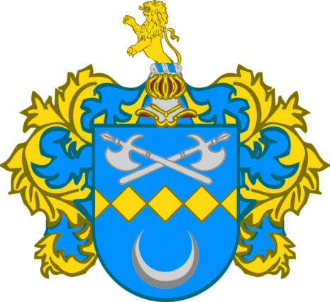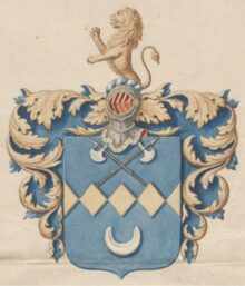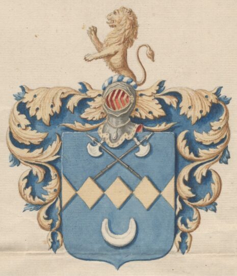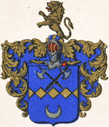 ”… En på twären mitt i tu delad blå Sköld, hwars afskäring är belagd med Fem Gyllene Rutor, de trenne medlersta hela och båda sido Rutorna halfwa. I det öfra Fältet äro twänne Bande- och Barre-wis stälde Hillebårder eller strids Yxor af Silfwer, och i det nedra, synes en med spetsarna upåt wänd HalfMåne äfwen af Silfwer, Skölden är betäckt med en Öppen Tornerhjelm, prydd med en af Silfwer och blått wriden Krantz, hwarpå upstiger ett åt höger wändt uprättstående Gyllene Leijon, Löfwärcket är utwändigt af Guld och inwändigt blått. Aldeles som det med sina rätta och egenteliga färgor här afmåladt finnes.”