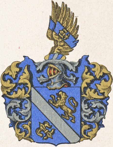..Een blå Skiöld med en Sölfwerbande, öfwer Hwilcken wijsar ett gående Leyon af gull, och under den samme en bandewijs stält Lillia af samma metall. Åfwan på Skiölden står en öppen TornerHielm, Hwarutur upstijga twenne i profil stälte gyllene Wingar, hwardera zirade med en blå Bande, och derpå en Lillia af gull. Krantzen och Löfwärcket är af gull, Sölfwer och Blåt, aldeles som sielfwa Wapnet med deβ egentelige färgor här står afmålat och repræsenterat….