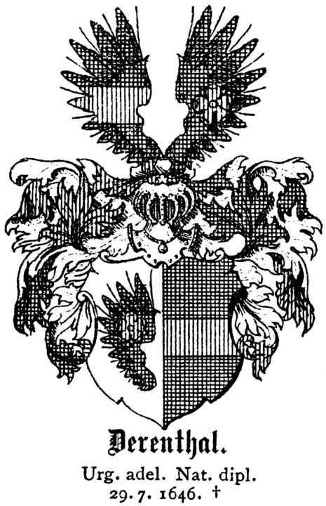 …en fördeelt Sköldh, Vthaff hwilcken den högre deelen ähr Hwijt, och där Vthj en opprätt Swart Örnewinga, hafwande en Rödh Roos mitt oppå, den andre deelen Swart, och där mitt Vthj en Rödh biälcke; Åffwan oppå Skölden en öppen Tornerehielm, Hielmtäcket och Krantzen medh Hwitt, Rött och Swart fördeelte; Och där oppå Twå Swarte Örnewingar, den ene på högresijdan medh en Rödh Biälcke fördeelt, och den andre på wänstre sijdan, medh en Rödh Rooβ mitt oppå, aldeles som dedh medh sine egentlige färgor här affmålat finnes;…