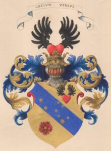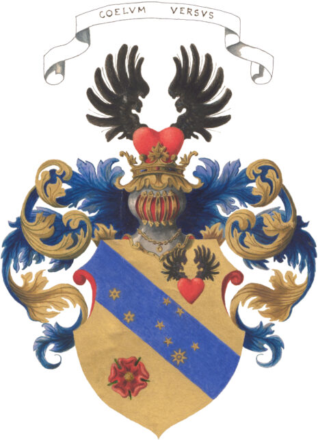 ”… En rätt uppstående Fransysk sköld af guld, styckad af ett azurbälke, hvarå synas i guld stjernbilden Lyrans åtta stjernor. Deribland strålar nederst af första storleken stjernan α) eller Vega. Öfver bältet Synes ett rödt hjerta, hvarur gå två utslagna Svarta vingar. Under bältet Synes en fembladig röd ros med antydda fem gröna blomfoderblad. På skölden är stäld en femgallrad tornerhjelm, till det inre klädt i rödt och till det yttre af stål i naturlig färg, med gyllene hjelmgaller och skoning af guld. Omkring hjelmens hals Synes en gyllene riddarkedja med dervid fästadt Smycke af guld. På hjelmen hvilar en adlig krona af guld, hvarur uppstiger ett rödt hjerta med derifrån utgående tvenne utslagna Svarta vingar. Öfverst Synes på ett hvitt fladdrande band valspråket: COELVM VERSUS. Från hjelmen utgår å ömse sidor det nedåt sköldens sidokanter lätt omgifvande löfverket, Som till det yttre är af guld och till det inre är azur.”