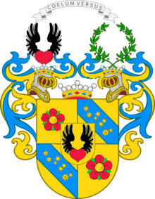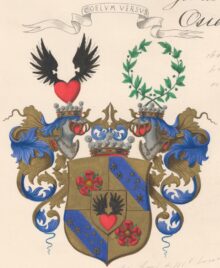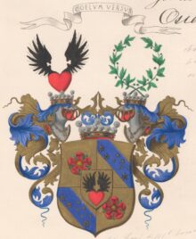 ”… En fyrdelad gyllene sköld, belagd med en likaledes gyllene hjertsköld, innehållande den del af adeliga vapnet, som utgöres af ett rödt hjerta, hvarifrån gå tvenne utslagna svarta vingar. Uti första och fjerde fälten synes en röd fembladig ros med fröhus af guld och gröna blomfoder, och i andra och tredje fälten en blå stjernbelagd balk, liknande den, som förekommer i adeliga vapnet. På skölden hvilar en friherrlig krona mellan tvenne, med dylika koronor krönta öppna tornehjelmar. Ofvanpå den högra tornerhjelmen synes den adeliga hjelmprydnaden, hvilken utgöres af bilden i hjertskölden och på den venstra tvenne gröna lagerquistar, som tillsammans bilda en krans. Det skölden omgifvande löfverket är af blått och guld. Öfver vapnet säfvar på ett hvitt fladdrande band valspråket ”Coelum versus”.”