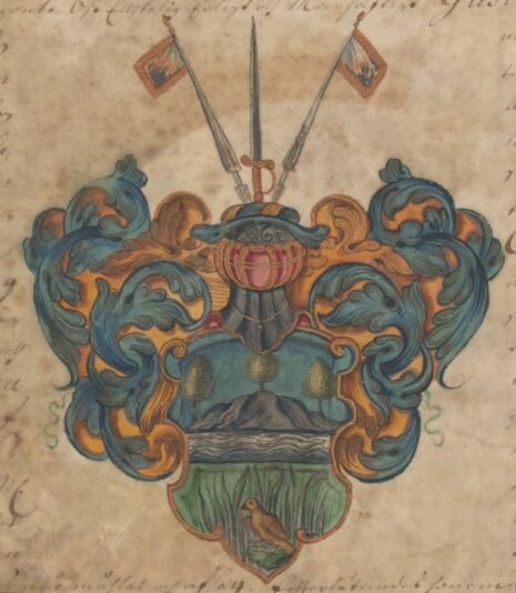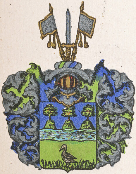 ”… en Skiöldh, fördeelt twärt öfwer i Twenne fäldt, emellan dem en rätflytande Ström. J det öfre fäldtet som är blÃ¥tt, stÃ¥r et grÃ¥t bärgh och deröfwer pÃ¥ trenne Lindar, J det nedre feltet af grön botten är en RörDromme uthj grÃ¥ Hwaβ. OfwanpÃ¥ Skiöldn är en Öppen Tornerehielm, hwaruthur opstiga twenne hwijta Estandarer, emellan dem en dragen wäria, Vddn opwändh Löfwärket och Hielmtäcket af gohl och blÃ¥ ferga sammanmengde, aldeles som sielfwa Wapnet medh sine egenteliga Färgor här hoos ståå mÃ¥hlat och afsatt…”