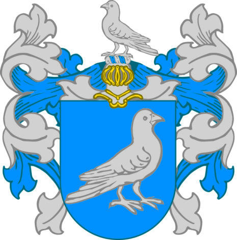 ”… een försölfradt duffwa wtj ett blåt fieldh, Item een öpen tornere hielm i krantzen och hielm teket huit och blåt, der Åffwan wppå och een försölfrat dufwa, så att alle och alle hans Ächta barn och efter kommande arfwingar samme skiöldh och Skiöldmerke, …”