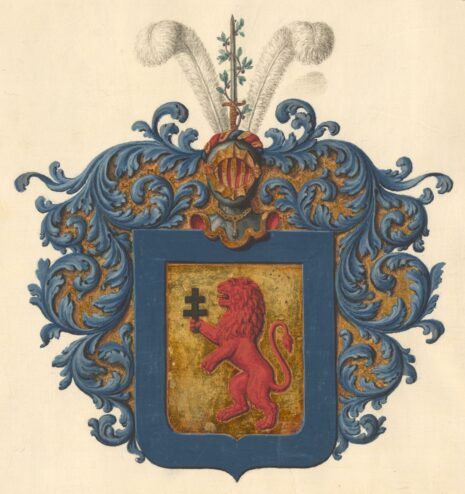 ”… En med blå ram omgifwen Gyllene Sköld, hwari upreser sig ett till höger wändt rödt Leijon, hållande uti högra framfoten ett swart Patriarchal_eller dubbelt Korss. På Hjelmen, som är betäckt med en af Guld, blått och rödt wriden Hjelmkrans, wiser sig, emellan twänne hwita Strussfjädrar, ett med spetsen upwändt Swärd, försedt med fäste af Guld och omlindadt med en grönskande Lagerqwist. Wapentäcket, eller det så kallade Löfwärket, är utantill blått samt innantill af Guld; aldeles som det med sina rätta och egenteliga färgor här afmåladt finnes.”