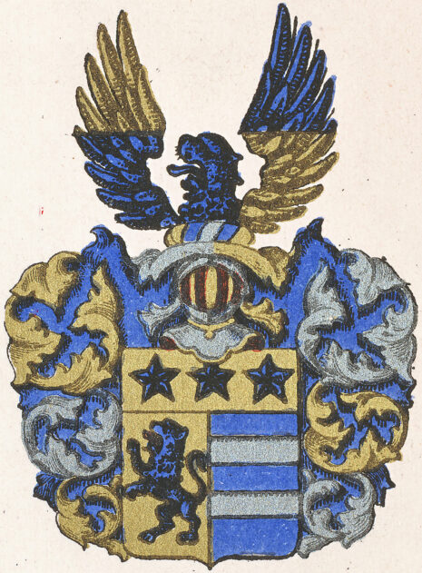 ”… Skiölden fördeeld i trenne deelar, den öfra deelen är een Chef af Sölfwer, hwarutj wijsa sigh trenne blå Stiernor, af dhe twenne nedre Fälterne är det högra af Gull och därutj ett blått Leijon, det wänstra Fältet är blått, hwarutj ligga trenne bielkar af Sölfwer, ofwan på Skiölden står een öppen TornerHielm, hwaruthur opstijger ett blått LeijonHufwud emillan ett pahr Wingar medh Gull och blått, hwar om annan fördeelte, Crantzen och Löfwärket är af Gull, Sölfwer och blått, aldeles som sielfwa Wapnet medh deβ egentelige färgor här hoos står afmåhlat och repræsenterat.”