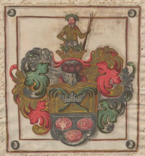 …en Skiöldh fördeelt i tuu fält, det öfwerste guult, och deruthi 2 Palmqwister Korswijs igenom en Silfwer Crona det understa hwit medh tree Törne Rosor uthi. Öfwer Skiölden en öppen Tornerehielm medh Crone uppå hwar uthur upstijger en Wildh man medh Guldh och Sölfwer Uthziradh löfwärket omkring medh rödh, gul, hwijt och grön ferga under hwarandra förmengde aldeles som Wapnet här hoos ståår medh sine färgor afsat…..