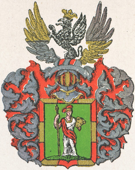 …nedre uthj sielfwa Skölden, Pallas Ståendes uthj ett grönt fäldt, Ofwan på Skölden een öppen Tornerehielm, och derofwan uppå een half Grijp medh een Gyllene Crona uppå hufwudet, och å hwardera Sijdan twenne Wingar, fördehlte medh Guhlt och Hwitt, Krantzen och Löfwerket af Hwijt och blå färga, under hwar andra förmengde, Aldeles som sielfua Wapnet här, med sine egendtlige färgor repræsenterat och afmåhlat Står…..