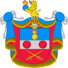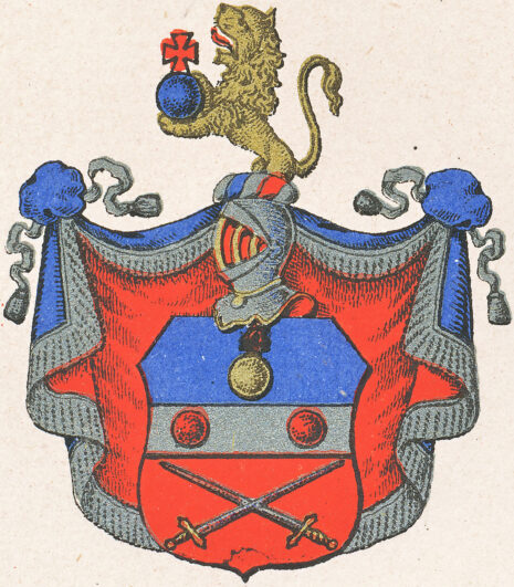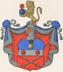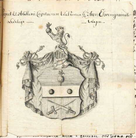 ”… En Swensk Skiöld, mitt uppå twärdelad af en Silfwer Bielcke, belagd med Twänne röda Kulor, i bredd stäldte. I fältet ofwanföre Bielcken, som är blått, ses en brinnande Granat af Guld, och i det andra som är rödt, äro twänne gyldene Swärd i Korβ lagde, med spetsarna upwände, Uppå Skiölden står en öppen Tornerhielm, hwarutur till hälften upstiger ett till höger wändt gyldene Leijon med öppet gap och utsträckt röd tunga, hållande emellan Ramarne en blå brinnande Granat. Hielm Krantsen är wriden af Guld, silfwer, Blått och rödt, och wapentäcket är blått underfodrat med Rödt, samt ziradt och upbundit med silfwer frantsar och snören, Aldeles som detta Wapen med sina rätta färgor härhos afmåladt finnes.”