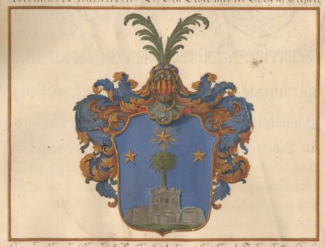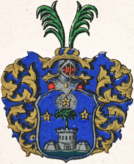 ”… En Blå Sköld med en Borg af Silfwer, hwarutur upstiger ett Palm-träd, omgifwit med Trenne Gyllende Stjernor, hwar af den Öfwersta utsprider Gyllende Flammor. Åfwan på Skölden ses en öppen Torner-hjelm, hwars prydnad är Twänne Palm-qwistar af naturlig Färg. Löfwärket är af Guld och Blått: Alldeles som detta Wapen och företecknade Sköldemärke med sina rätta färgor här hos afmåladt finnes.”
