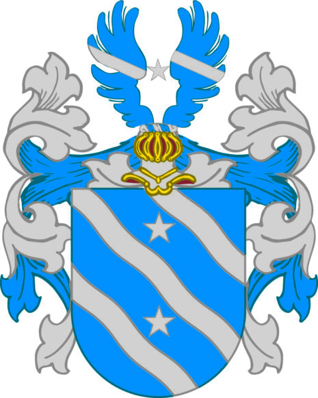 ”… Een Blå Skiöldh, hwari löpa trenne Bandhewijs Steltte Strömmar af Sölf:r, emellan hwilcka lysa twenne stiernor jämwähl af Sölfwer, ofwan på Skiölden står een öppen Tornerhielm, hwaröfwer en Sölfwer stierna emellan ett Par Blå wingar, hwardera medh een Sölfwerbande Zijrade, Krantzen och Löfwercket är af Sölfwer och blått, Aldeles som sielfwa Wapnet med des Rätta och egänteliga Fergor här hoos Står tecknadt och Afmåhlat; …”