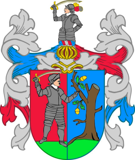 ”… Een Skiöldh fördeelt vthi rödt och blått fäldt, vthi den eena röda een bewäpnadt Man vthi fult stållfärga Cüriss, hållandes i högre handen öfwer hufwudet een Sabbel, i den andre och wänstre deelen af blå färga een Eek wäxt vthur ett bärgh, medh een blomstrande green och deruppå twenne förgylte ållon, der dhen bewäpnade Mannen om fatthar, medh sin wänstre handh, åfuan vppå Skiölden een öppen förgylt Tornerhielm Täcket och Crantzen medh rödt, huit och blåtth fördeelte, åfuan vppå hielmen deslijkest een bewepnadt man i fult stållfärga Cüriss medh een stormhat på hufwudet, beprydd medh gula, huita och röda fiädrar, hafuandes i handen een Sabbell, alldeles och effter dee färgor som vpsatte och afmålte Wapen specificerar och vthwijsar.”