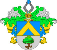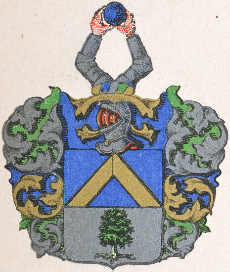 ”… En Skiöld fördeld i twären utij twenne delar, det första Fältet är blått i hwilket är en Sparre af gull, det andra Fältet är af silfwer, hwar uti står ett Eketrä. Ofwan på Skiölden står en öppen Tornerhielm, hwar uppå äro twänne bewäpnade Armar hållandes en blå Kula emellan händerne. Crantzen och Löfwärcket är af gull, silfwer, blått och grönt, aldeles som detta Wapn med des rätte färgor här hos afmålat finnes: …”