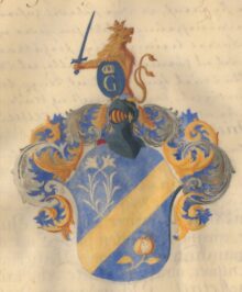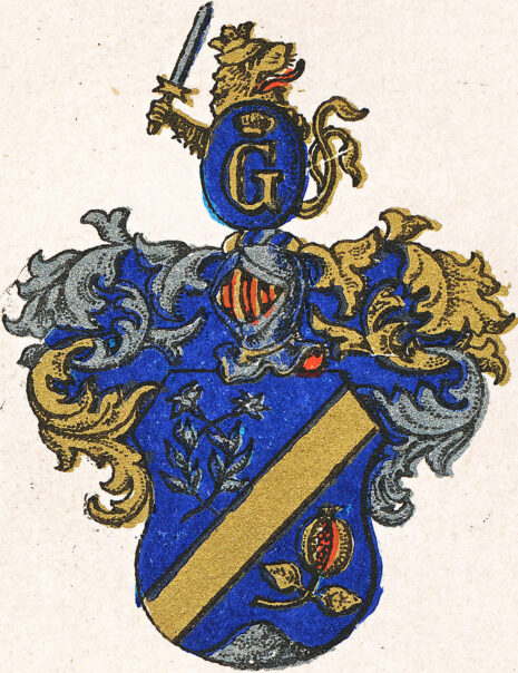 ”… En Blå Skiöld, hwaröfwer ligger en Guld-Barre, ofwanför Hwilken synes Twå om hwarannan Krants-Wis lagde Naturlige Lilljor af Silfwer, med sine Stielkar och Blad af Samma Metall. Och nedanföre Densamma Ett Granat Äple med Stielk och 2ne Blad af Guld, men Kärnorne äro Röda. Uppå Skiölden står En öpen Torner-Hielm, med En Bourlett ofwan uppå af Guld Silfwer och Blått: utur hwilken sig upreser Öfwre-Dehlen af Ett Krönt Gyldene Leijon med klufwen Swantz, hållandes i Högra Ramen Ett Blådt Swärd, och med den Wänstra En Blå Skiöld uti hwilken wisar sig ett Stort Latinskt G, af Guld, med En Krona deröfwer af Samma Metall. Löf-Wärket är af Guld, Silfwer och Blådt: aldeles, som detta Wapn med des egentelige färgor härbredewid afmåhlat finnes.”