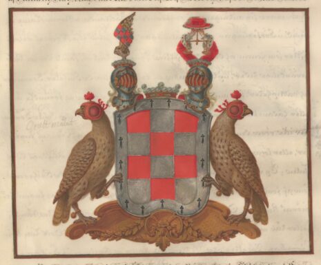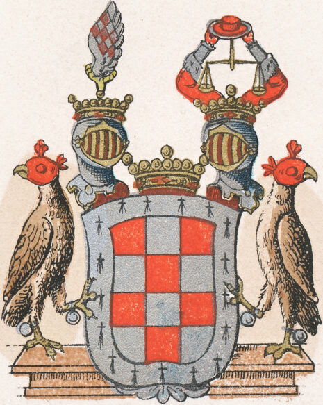 ”… En Skjöld, bestående af Tolf Schack-Rutor, Trenne i bredden och Fyra i Längden, ömsom Röda och ömsom af Silfwer infattad i en Sifwer Ram eller Bordure, som alt omkring är beströdd med Sjutton Swarta uprätt ståend Herminer. Uppå Skjölden ses Twenne med Fri Herre Cronor täckte Öpne Tornere Hjelmar, och emellan dem en större Fri Herre Crona. Utur den Högra Hjelm Cronan upräcker en Wänster Falkfot en Wänster Falkwinge af Naturlig Färg, belagd med en Bande af Tolf Röda och Silfwer Schack Rutor. Och utur den Wänstra Hjelm Cronan upräcka Twenne i Röd Klädnad med Hermelins Bräm Klädde Armar en Gyllende Wigtskål, som ofwantill betäckes af en Röd Hermelins brämad Råds Hatt. Skjöldhållare äro Twenne tilbaka seende Falkar af Naturlig Färg med förbundne Ögon och Bjällror på Fötterna, stående lika som Skjölden, uppå en decorerad och med Blomster Zirad Pied d’Estal. Aldeles som det samma här frammanföre mid sina rätta Färgor afmålat finnes.”