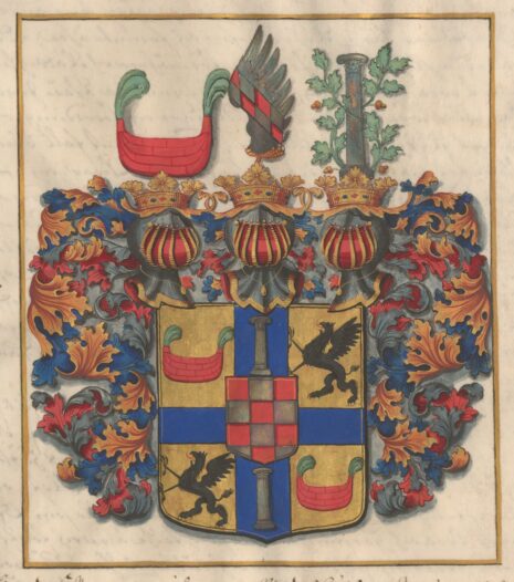 ”… En Skiöldh, fördeelt genom Twenne strek i längden, och ett i twäran, uthi Sex Feldt, och mitt uthi dhensamma står det Gambla Falckenbergiske Stam-Wapnet, som medh Twenne strek i Längden och trenne i Twäran ähr fördeelt, i Tolff Rutor; warandes samme Rutor medh Sölffwer och Rödt hwarom annan fördeelte; Men i dhet Första Feldtet aff sielffwe Greffwelige Wapnet ståår dhet gamble Bonde-Wapnet, som är een Rödh Båth i Gull Feldt; Dhet Andra Fäldtet ähr Blått, hwaruthi ståår en upreest Pelare aff Sölffwer; Dhet Tredie Fäldtet ähr aff Gull och dheruthi en Swart Grijp; Dhet Fierde Fäldtet ähr öffwer allt lijkt medh dhet Tredie, föruthan dhet, att dheröffwer ähr en Blå Chef; Dhet Fembte Fäldtet ähr till alle dhes deelar lijkt medh dhet Andra, så och dhet Siette medh dhet Första, doch att dheröffwer iämwähl ähr stält en Blåå Chef; Åfwan på Skiölden stå Trenne öpne Tornerehielmar medh een Greffl: Crona på hwarthera Hielmen; uthur den medelste Hielm-Cronan wijser sigh en Gyllene Örnefoot hållandes en Winge aff Sölffwer emillan Kloerne, hwilken Winge på samma sätt som sielffwe Stam-Wapnet Rutewijs doch i snedden fördeelt ähr, som dhet tillförene öffwer dhet Gambla Stamm-Wapnet warit haffwer; Ofwer dhen högre Hielm-Cronan står een Rödh Båth i dhet skick, som dhen gambla Bonde Familien dhen samma fördt haffwer; Öfwer dhen Wänstra Hielm-Cronan wijser sigh en Pelare aff samme Metall, som i sielffwe Skiölden; hwilcken med Twenne Grönskande Ekegreenar ähr omweklad; Löffwercket är aff Gull, Blått, Sölfwer och Rödt; Aldeles som samma Greffwelige Wapen med sine Egenteliga och Naturlige Färgor häriempte står repræsenterat och affmåhlat; …”