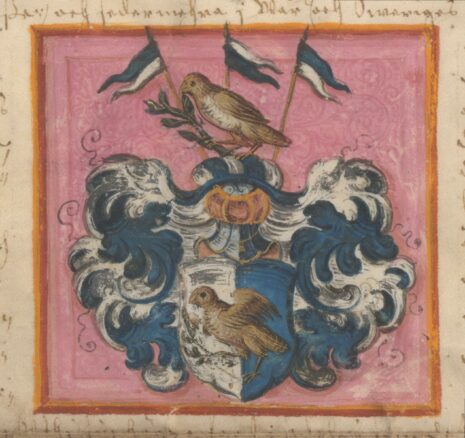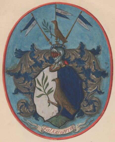 ..En fördeelt Sköld medh Blått och hwitt j och inne Vthj Skölden en Falck medh förgylt Vääf, ståendes på sin Wänstre foot, och j högre foten hållandes en afbruten Green j Ofwan på Skölden, en öpen Tornerehiälm, Krantzen och hiälmtäcket medh Blått och hwitt fördeelt, och på hiälmen en Falck ståendes emillan Trenne fahnor fördeelte medh Blått och Hwitt, hållandes fahnor j Hiälmen, en afbruten Green Vthj sin högre foot j aldeles som det här medh sine egendtlige färgor afmåhlat ståår, …..
