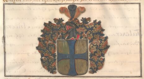 ”… Een Skiöld af Gull, hwaruti sees ett blått Korss som med sine fyra ändar rör kanterne af Skiölden; Ofwan på Skiölden står en Öppen Tornerhielm, hwarutur upstiga trenne Strussfiedrar, af hwilcka den medlersta är blå, och de bägge yttre af Gull; Krantzen och Löfwärcket är af Gull och blått, aldeles som detta Wapen med sine egentelige färgor här brede wid afmålat finnes.”