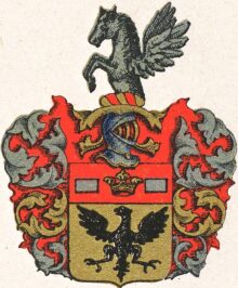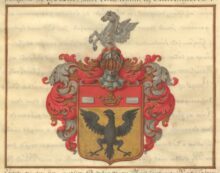 ”… En Skjöld af Guld, hwaruti sees en Swart Fläckt Örn, Hufwudet wändt emot Höger, och där åfwanföre en Röd Chef, belagd med en Öppen Crona af Guld, beledsagad med Twenne Billetter af Silfwer. Ofwan på Skjölden sees en Öppen TornereHjelm, hwarutur till Hälften upreser sig emot Höger en Flygande Pegasus af Silfwer. Krantzen är wriden af Guld och Rödt, och Löfwärcket är i grunden af Guld, men i dagen af Rödt och Silfwer, ömsom om Hwar annan blandade. Aldeles som det samma Här nedanföre med sina rätta och egenteliga Färgor afmålat finnes.”