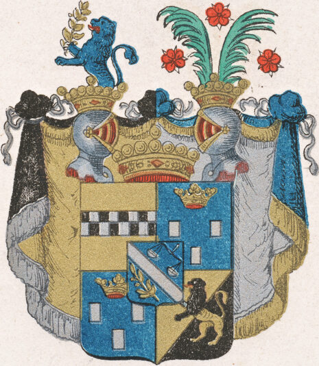 ”… En Skiöld fördelt i Fyra Fält, och mittuppå Fördelningen des förre Adeliga Wapen, som är en Skiöld af blå Färg, hwaröfwer går en Bande af Silfwer, emellan emellan en Wikt-Skål af Guld, och en Lagerqwist af samma Metall: Men af sielfwa Friherrliga Wapnet är det första Fältet af Guld, öfwer hwilket ligger en Bielke, bestående af twänne Radar Schack-Rutor med swart och Silfwer om hwar annan fördelte. Det andre Fältet är blått, hwaruti lyser en gyllende Krona öfwer tränne försilfrade Billetter. Det Tredie Fältet är uti alt lika med det andra: Men det Fiärde är barrewis med Guld och swart färga lika fördelt, wisandes sig mittpå Fördelningen ett Leijon, som skiftar sig emot Metallen och couleuren. Ofwan på Skiölden äre twänne öpne Tornerhielmar, med en Friherrlig Crono emellan, och en på hwardera Hielmen. Utur den högra Hielm-Cronan upstiger öfra delen af ett blått Lejon, som med högra Ramen håller en Lagerqwist af Guld. Uppå den wänstra stå twänne gröna Palmqwistar emellan trenne röda Roser. Hielmtäcket är af guld och swart, samt Silfwer och blått, aldeles som detsamma med sina egenteliga Färgor här hoos afmålat finnes, …”