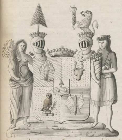 ”… En Fyrdelad Skjöld och midt på Fördelningen Hans förra Adeliga Skjöld, som war twärdelad, Öfra delen af Silfwer och däruti en Grön Gran, nedra delen Grön och däruti twenne i bredd stälde Kulor af Silfwer. Af Friherre-Skjölden är det första Fältet Grönt, hwaruti Åtta Stycken Gyllende Ax upwäxa ifrån en fritt stäld Tufwa. Andra Fältet af Guld och däruti et Rödt Oxehufwud, stäldt en face, som är det Adelige Hårde-Wapnet. Tredje Fältet likaledes af Guld, och däruti den Adelige Uggle-Famillens Skjöldemärke, en blå Uggla til Wänster stäld, hållande en grön Palmquist och hwilande på trenne Röda Tegelstenar. Fjerde Fältet Blått och däruti twenne i Korss lagde Gyllende Fahnor, samt öfwer dem en stolpewis uprest Canon af Silfwer. Uppå Skjölden stå Twenne med Friherre-Cronor täckte Öpne Tornerhjelmar, imellan hwilka på hjelmen en större Friherre Crona hwilar. Uppå Högra hjelmen ses en upwäxande, Grönskande Gran, och uppå den Wänstra et til höger wändt upstigande Lejon, ofwantil med Guld och nedantil swart fördeldt, hållande en Fascis Romana imellan Ramarne. Skjöld-Hållare äro, til höger en Ceres och til wänster en Vertumnus, den förra med sin Kärfwa och Skjära, den sednare med sit Ömnighets-Horn och sina Frugter, stående, jemte Sjölden, på en af Trenne Afsättningar bestående Grön Kulle: Aldeles som det samma här frammanföre med sina rätta och egentel:a Färgor afmåladt finnes.”