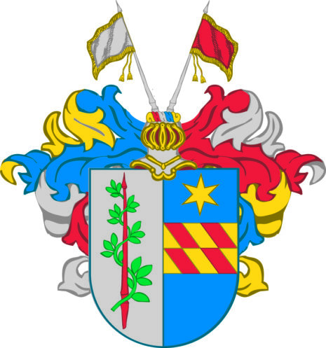 ”… Een skiöldh fördehlt i längden uthi tvenne lijka delar, af hvilcka det högre fältet af sölfver, hvaruthi een rödh lantz omvecklat medh een grön lagerqvist, men det vänstra fältet blått, hvaruthi en rutevijs i snedden fördelt bielke, hvaraf den ena rutan af gull och den andra rödh. Öfver bielken een sexuddat stierna af gull. Åfvan på skiölden een öppen tornerhielm, hvar öfver tvenne estandarer, den högra af sölfver och den vänstra rödh. Crantzen och löfvercket af gull, blått, sölfver och rödh, aldeles som det medh sine egentelige färgor här ofvanföre afmåhlat ståår.”