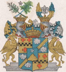 ”… En Skiöld fördelt i Fyra Fält, och mituppå Fördelningen des förre Adelige Stam-Wapn, som är, En Skiöld af blå Färg, hwaruti lyser en försilfrad Stierna öfwer ett gyllende Berg: Men af sielfwa Friherrliga Wapnet är det första Fältet af Guld, i hwilket sees en Bielke, bestående af twänne radar Schackrutor, med Silfwer och swart om hwarannan fördelte. Ofwan för Bielken äre twänne Korsz af röd Färg, och under densamma ett Korsz af samma Färg. Det andre Fältet är blått, hwaruti wisar sig en gyllende Barre emellan twänne Muszlor af Silfwer. Det Tredie Fältet är i alt likt med det andra, så ock det Fiärde med det Första. Ofwan på Skiölden stå twänne öpna Tornerhielmar med en Friherrlig Krona emellan, och en på hwardera Hielmen. Öfwer den högra Hielm-Kronan sees en försilfrad Stierna emellan en grön Graan- och en Tall-Qwist korszwis lagde: Men öfwer den wänstra en Lilia af Silfwer, emellan twänne utslagna och i twäran med Guld och blått om hwarannan fördelta Wingar. Löfwerket är af Guld, Silfwer, blått och rödt, aldeles som samma Skiöld och Wapn här afmålat finnes.”