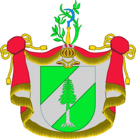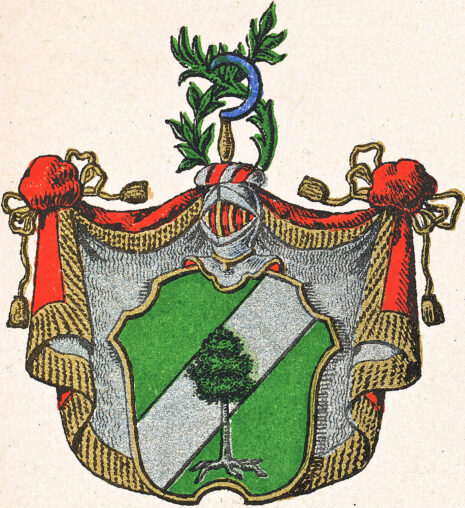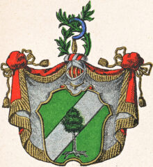 ”… En i Tre lika delar ginstyckad Skjöld, hwaraf de öfra och nedra äro Gröne, men den medlerste är en Barre af Silfwer. Ifrån Skjöldfoten upwäxer en grönskande Furu som med sin Krona och halfwa Stam faller in i Barren eller Silfwer Fältet och sträcker up in emot Barrens öfre kant; Men den nedre Stammen med sin femgrenade rot Wäxlar af til Silfwer i det gröna Fältet. Ofwanpå Skjölden ses en öppen Tornerhielm hwaruppå är uprest en mot höger wänd blå hand-skiära med Gull skaft, omgifwen med en Lagergren til höger och en Palmquist till wänster som ofwantill för handskiäran fläta sig tillsammans. Hjelm krantsen är wriden af Silfwer och rödt, och Wapentäcket är rödt, under fordrat med Silfwer, samt Zirat och upbundit med Gyldene Kransar, snören och toffsar. Aldeles som det med sina rätta och egenteliga färgor här afmålat finnes.”