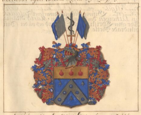 ”. . . En BlÃ¥ Skiöld, hwarutj stÃ¥r en Sparre af Sölfwer emellan trenne Gaddar af samma metall, in pÃ¥ sielfwa Sparren wijsa sigh femb blÃ¥ Kuhlor; Öfwerst i Skiölden är en chef af Gull med trenne röda granat Kuhlor. Ã…fwan pÃ¥ Skiölden stÃ¥r en öpen Tornerhielm hwarutur upstijger ett uprätt Swärd omweklat med een swart Orm emellan fyra fahnor med Sölfwer och blÃ¥tt hwaromannan fördelte. Krantzen och Löfwärket är af Gull, Sölfwer, blÃ¥tt och rödt, aldeles som detta Wapnet med deβ rätta färgor här hoos stÃ¥r repræsenterat och afmÃ¥hlat.”