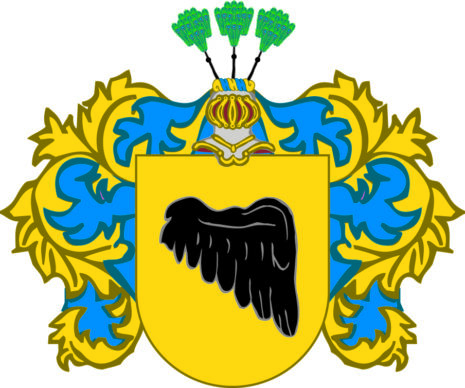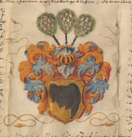 ”… Een guull skiöldh, der Vthi een Swartgrå Tranewinge, och ofuanpå Skiöllden een öpen Tornerehielm, Täcket och Crantzen medh Blått och guuldt fördeellt, och ofuan på Hielmen tre Påfougle Stierter vthj swart skafft infattade; efther såsom hans förfädher, det tillförenne fördt hafua, och sielfua Afmållningen här brede wijdh Vtwijsar, …”