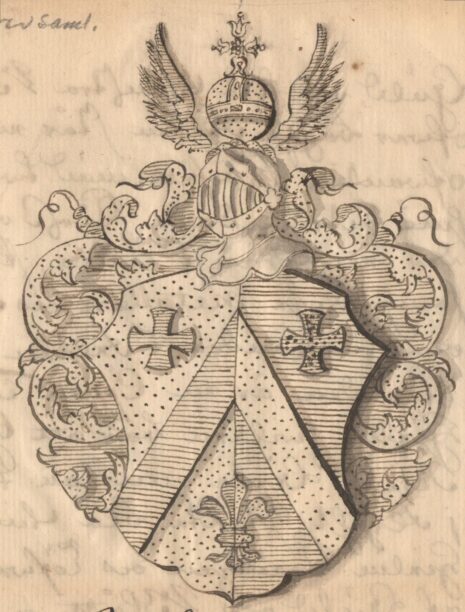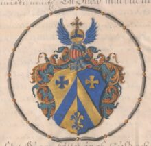 ”… En Skiöld mitt i tu klufwen, hwaraf det Högre Fältet är af Guld, och det wänstra Blått. Öfwer bägge Fälten står en Sparre, ofwantill sidosatt med twenne små utrundade kors och inunder en Fransk Lillja, skifftande samtelige Metallen och Färgen om hwarandra i Fälten. Uppå Skiölden är en Öpen Tornerhielm, hwilcken bär et Gyllende Riks-Äple emellan Twenne i Flycht stäldte Blå Wingar. Hielm-Crantzen och Löf-Wärket är af Guld och Blått: aldeles som samma Wapn med sine egentelige färgor härhos finnes afmålat.”