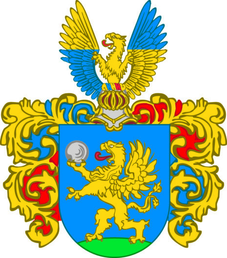 ”… en Skiöldh af ett blått Felt medh en Guul grijp uthj, ståendes på ett grönt Bärgh eller backa oprätt, hållandes i högre Kloon en Kuhla, Wingarne uthslagne och medh Sölfwerstrimmor bemängde, ofwan på Skiölden en öppen Tornerehielm, och deruthur opstijgandes en half grijp, som medh bägge framfötterne grijper i dhe på bägge sijdorne opstående Wingar half gula och half blåå. Lööfwärcket är af Rödh, Blå och Guhl färga under hwar andra fördelte, alldeles som det uthj wårt Cantzlij ingifne Wapn uthwijsar, …”
