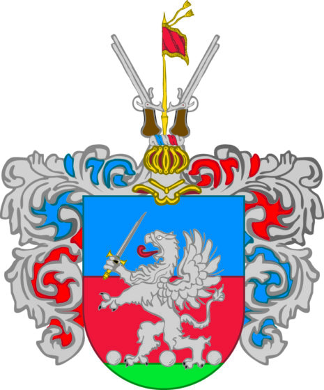 ”… Skiölden i twå deelar den öfre Blåå, den Undre Rööd, fördeelt, dher uthj een hwijt Grijp opreest på ett grönt bärgh, medh een dragen Wäria i dhen högre främste footen, ståandes emellan Tree kuulor. Öfwer Skiölden ähr een öpen Tornerhiälm, Hiälmtäcket och Crantzen ähr med Rööd, Blåå, och hwijt färga genom hwart annat fördeelt, Ofwan på Hiälmen ähre upreeste Twänne Pijstooler, och emellan dhem een Rööd Estandard, lijka såsom dhet medh sijne rätta färgor här reprasenterat och afmåhlat finnes.”