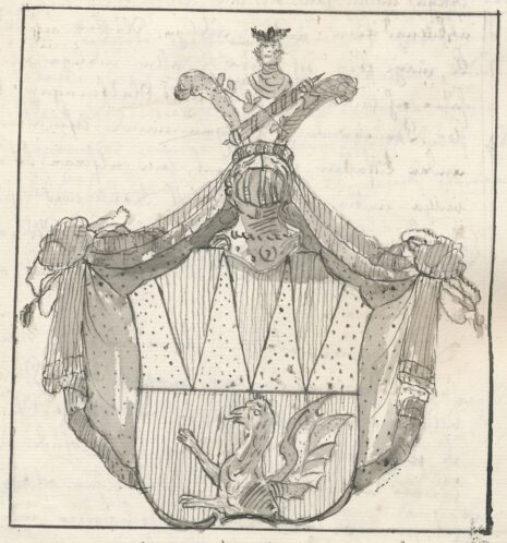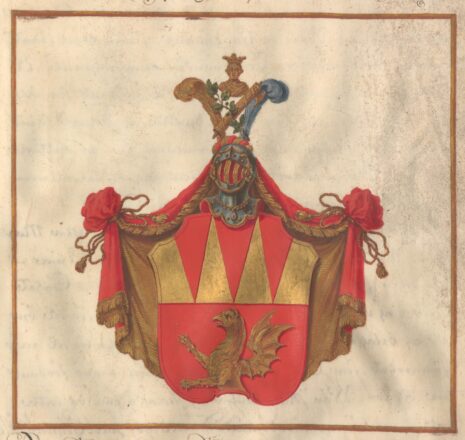 ”… En mitt i Tu af Guld och Rödt fördelad Skiöld: Uti det Öfra eller Guld-Fäldtet förekomma Trenne från Öfra Skjöld Kanten neder till delningen sammandragne Röda Strålar: Och uti det Nedra eller Röda Fäldtet ses en Half Grip med utsträckte Draka wingar af Guld emot Höger wänd. Ofwanpå står en Öppen Tornere Hielm, och deröfwer emellan Twenne Struss Fjädrar Korsswis lagde en grönskande LagerQwist, samt en Förgyld Fascis Romana, och åter deröfwer en Förgyld Buste eller S:t Erics Hufwud. Struss Fjädrarne äro, den till Höger Guld, och den till wänster Blå. Hielm-Krantzen är wriden af Guld och Rödt, och Wapentäcket är Rödt underfodrat med Guld, Zirat och upbundit med Gyllende Frantzar och Snöre. Aldeles som det samma här åfwanföre med sina rätta och egenteliga Färgor här Afmålat finnes.”