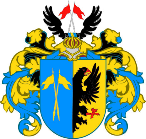 ”… Een Skiöld fördehlt i lengden uti twenne lijka dehlar, det högre fältet blått, hwaruti teenne kårswijs stälte fahnor af gull, det wänstra fältet aff gull, uti hwilkens halfwa dehl en swart flächt Örn, hwars näbb och foot rödh, åfwan på Skiölden en öppn [tornerhielm och] der öfwer twenne kårswijs stälte röda fahnor emillan et paar swarte Örnewingar. Crantzen och Löfwärket af gull, blått och swart, lijka som det med sine rätte och egentelige färgor här ofwanföre afmåhlat står.”