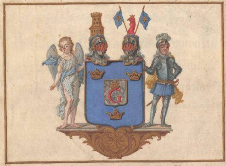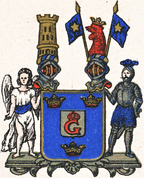 ”… En Blå Skjöld, hwaruti Trenne Cronor af Guld. Mitt uti Skjölden är En mindre Skjöld af Silfwer, uppå hwilcken ett Rödt G, Krönt med en Kongl: Crona. Ofwan på Skjölden stå Twenne Hjelmar. Aldeles som det samma här bredewid med sina rätta Färgor afmålat finnes.”